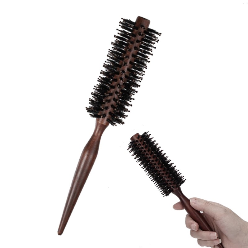 Στρόγγυλη βούρτσα μαλλιών με εργονομική ξύλινη λαβή.