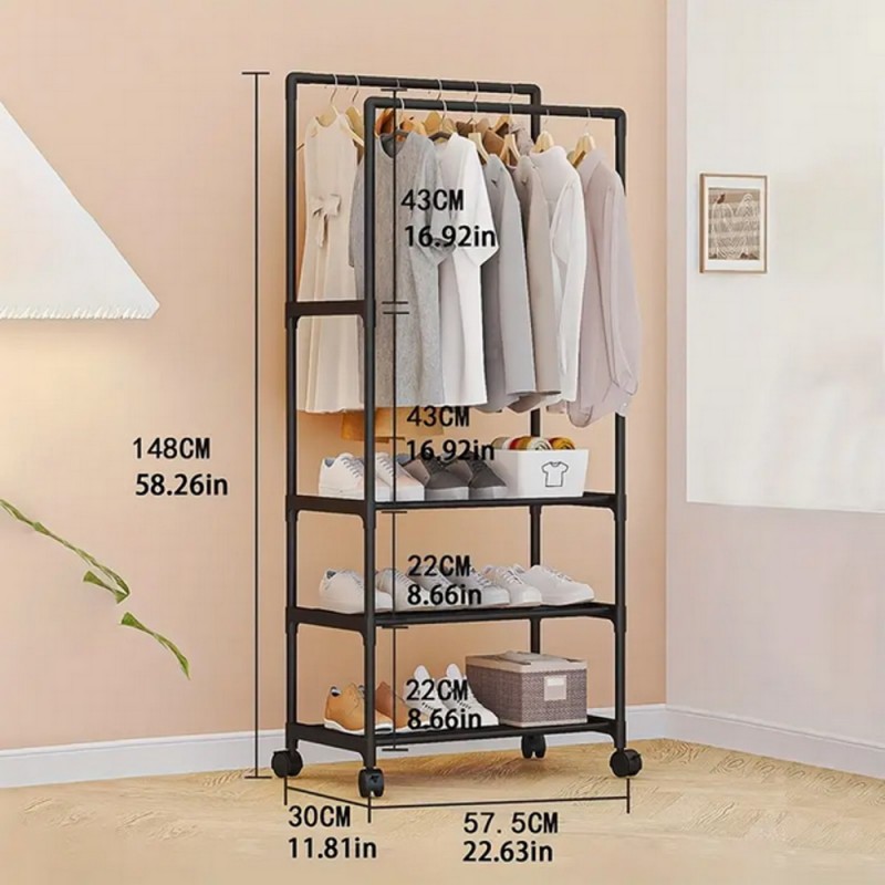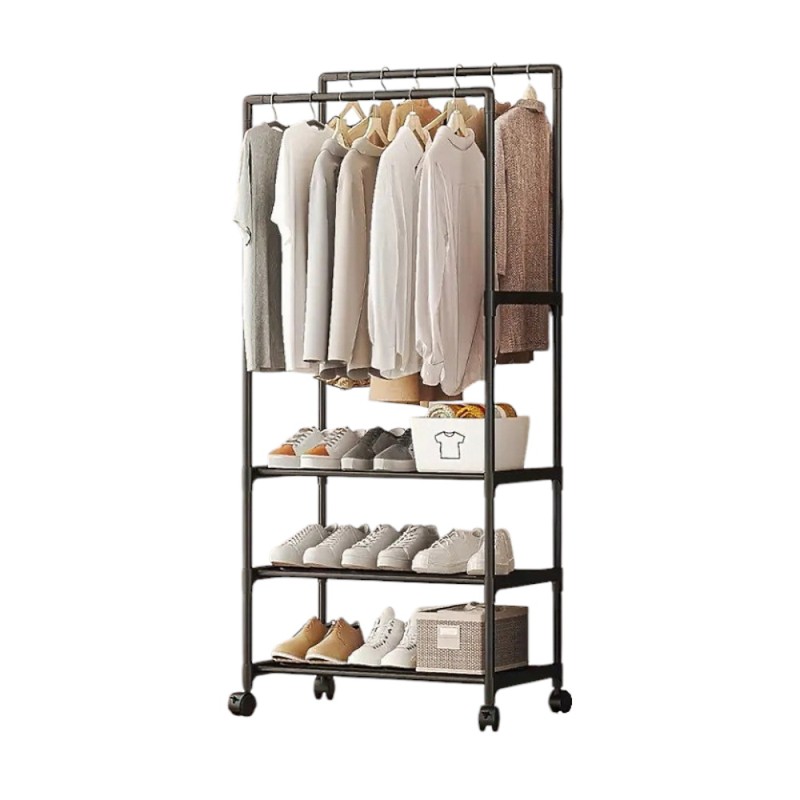 Τροχήλατη κρεμάστρα δαπέδου σε μαύρο χρώμα με 3 ράφια πολλαπλών χρήσεων.