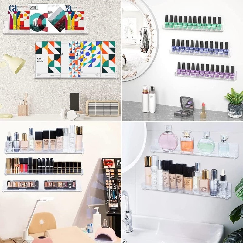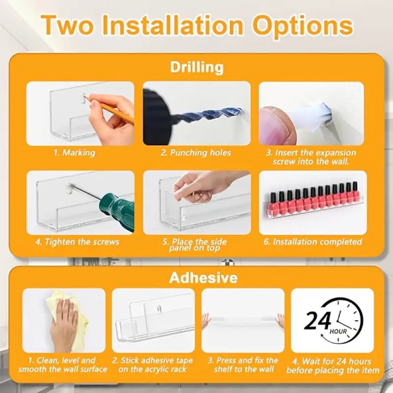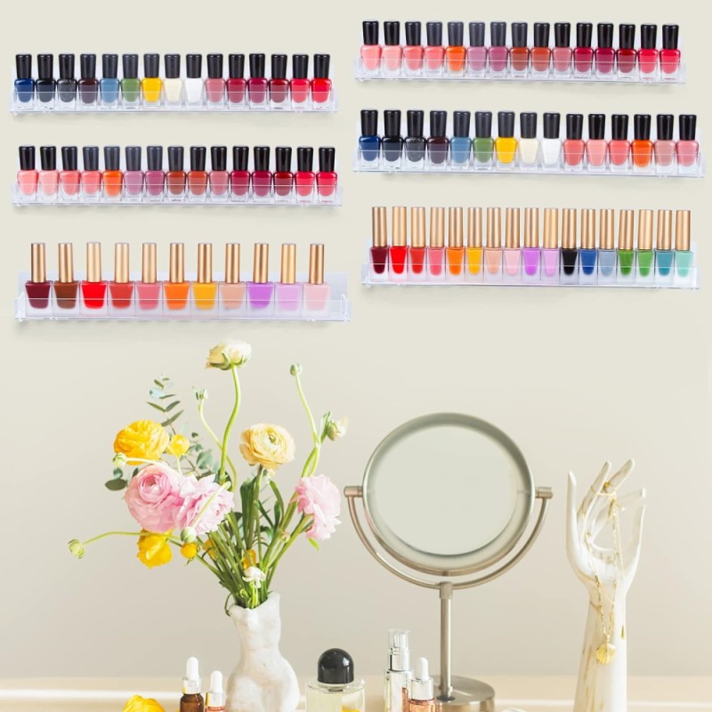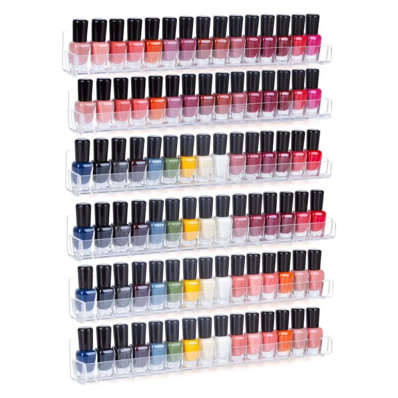 Συσκευασία με 6 επιτοίχια ακρυλικά σταντ σε διαφανές χρώμα, ιδανικό για τοποθέτηση βερνικιών και καλλυντικών.
