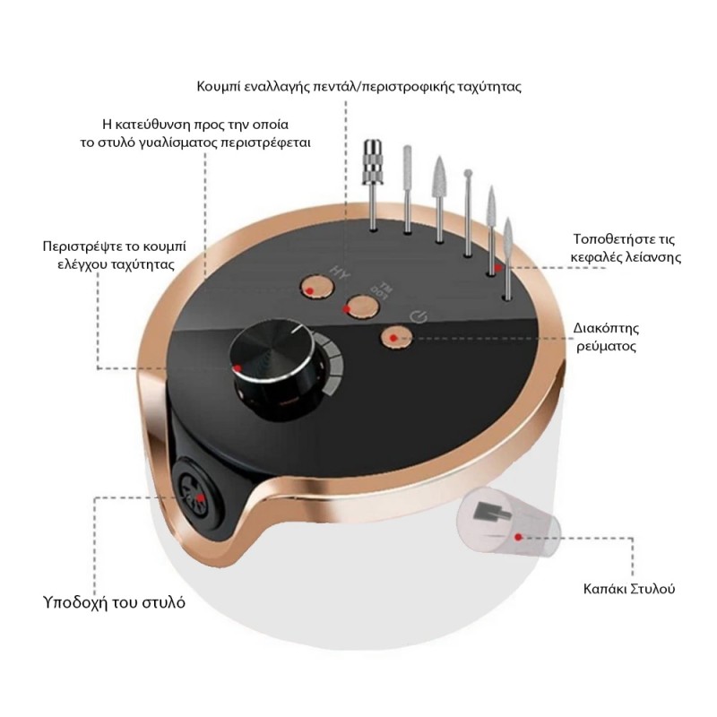 Αποτελεί μια συσκευή εύκολη στη χρήση και ικανή να εκτελεί όλα τα είδη των εργασιών για πεντικιούρ, μανικιούρ και επέκταση νυχιών.
